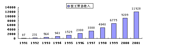 我国高科技园区在过去10年取得了飞速的发展,我们从创业企业数、技工贸总收入、工业总产值、从业人数、研发人员数、研发投入、出口、净利润、税收等九个指标的比较即可以看出,创业企业数从1991年的2587家增加到2001年的24293家(见图1),11年间增加了9.4倍,说明11年来我国高科技园区的创业活动十分活跃。从经济总量来看,技工贸总收入从1991年的87亿元增加到2001年的11928亿元,增长了142.5倍(见图2);工业总产值从1991年的71亿元增长到2001年的10117亿元,增长了137倍,占我国GDP的10%(见图3)。我国高科技园区的从业人数也有了快速的增长,从1991年的14万人增加到2001年的294.3亿元,增长了21倍。而高科技园区在研发方面的增长尤为显著,研发人员从1992年的6.7万人增加到2001年的45.8万人,增长了6.8倍;研发投入从1992年的15.2亿元增加到2001年的499.6亿元,增长了32.9倍。