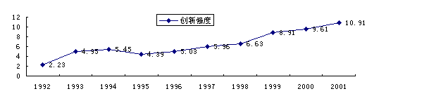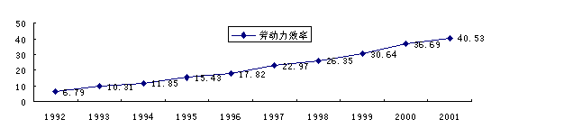 从相对指标来看,创新强度从2.23万元 /人增加到10.91万元 /人,增长了4.89倍(见图5)。园区企业竞争状况则较为稳定,20世纪90年代初期为0.12左右,2001年为0.1。从参与国际竞争力来看,创汇能力从20世纪90年代初保持一定增长后,从1995年开始一直稳定在0.15~0.17间。园区劳动生产率则有显著增长,由每人6.79万元增加到每人40.53万元(见图6)。产业技术智能密集度20世纪90年代初有所下降,从1996年开始稳步回升,达到16%。从以上数据分析,我国高科技园区在过去10年取得了惊人的发展,既有量的扩张,也有质的提升。我国高科技园区创新强度、产业智能密集度、劳动生产率的显著提高充分说明高科技园区已真正从粗放式发展向内涵式、集约式以研发为基础的发展方式转变,并已开始在高科技企业、产业及企业集群的发展上具有创新的特征和高科技特征。园区发展质量的提升无疑具有重要的意义,充分表明我国高科技园区将为创业板的科技型创业企业资源提供坚实基础。