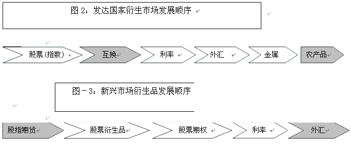 从传统来看,发达国家衍生市场的发展一般以农产品期货为开端,然后陆续设立金融期货、外汇衍生交易、利率衍生交易、股票(指数)期货(期权)、互换等交易品种。但随着商品市场全球化和农产品市场自由化的发展,新兴市场国家和国际市场之间商品价格的联动性大为增强,现有的国际性商品期货完全能满足新兴市场国家对冲风险的需要,从而削弱了它们开设本国农产品期货交易的兴趣。与之相反,发展中国家的证券市场和国际证券市场却处于相对分割的状态,其股价波动更多地受到国内因素的影响,股价运行具有相对的独立性,导致投资者运用股指期货避险的需求较为强烈,股指期货也因而成为新兴市场开设金融衍生交易的 图2:发达国家衍生市场发展顺序