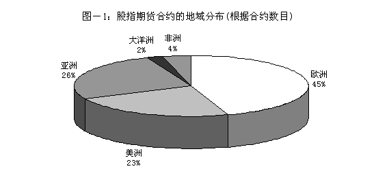 1983年,澳大利亚悉尼期货交易所开设了ASE股指期货交易,成为美国以外第一个推出股指期货的国家。进入90年代后,国际资本流动日益全球化,同时机构投资者逐渐成为金融市场上的主导力量,从而对风险管理工具和手段提出了更高的要求。在此背景下,发达证券市场和新兴证券市场竞相开设股指期货交易,形成了世界性的股指期货交易热潮。截至1998年底,全球有37个国家(地区)开设了近百种股指期货交易,在地理分布上多集中于美洲、欧洲、和亚洲地区(见图1)。