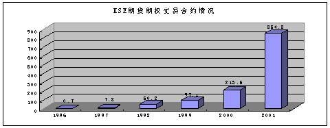 由表1所示的交易所2001年成交量看,韩国证券交易所(KSE)位列第一,它交易的衍生产品主要是KOSPI 200股指期货与股指期权,自1996年推出KOSPI 200股指期货、1997年开发出KOSPI 200股指期权以来,成交合约数飞速增长。1996年成交仅70万个合约,到2001年已达到8.55亿个合约,增长了1220倍, KSE1996~2001年的成交合约情况见图1。另外,韩国期交所(KOFEX)成交量也有较大幅度的增长,由300万个合约增长到1100多万个,增长近3倍。