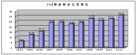 排在第二位的是新加坡证券交易所交易的金融衍生产品。新加坡证券交易所衍生产品交易部(SGX-DT)起源于1984年成立的新加坡国际货币交易所(SIMEX),主要进行金融衍生产品的交易,1984年成交15万个合约,至2001年成交3000多万个合约,比2000年增长了12%。SGX-DT的成交量从上世纪80年代中期至90年代早期增长非常快,从1994年开始逐渐步入稳定成长期,市场发育渐趋成熟(见图2)。