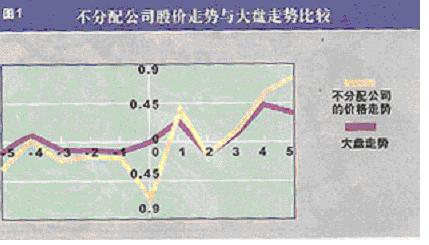 从图3可以看出,在0天以前的五个交易日,不分配类公司的平均股价与大盘走势基本平行,这可能说明有关的不分配信息尚未提前泄露,也说明我国上市公司在信息披露中对内幕信息的控制有所加强。在0天,不分配类个股平均股价不顾大盘急剧下探,这说明广大投资者对该类公司确实比较失望。但在0天以后,有所上扬,在2日受挫,2日以后打开上升通道,不断攀升。这可以从以下两个方面来解释:第一、不分配的公司中,经营业绩良好、主业突出的不少,对这类公司投资者可能放弃了今年获得回报的希望,看好今年中期或下一年度。并且暂不分配并不等于以后不再分配,而是分配时机和方案的选择更加灵活,可以更完善、周到地考虑解决好各方面的利益关系。例如湖北兴化96年度不分配,97年度推出了10送10的方案。第二,二级市场越来越注重股票的成长性。一般而言,派现有利于股东得到现实的回报,却减少了公司的资金积累;送股虽然使股股本扩张,股价成本降低,然而每股收益也进一步推薄,不利于公司的未来发展。暂不分配则使上市公司留下了一笔可观的流动资产,保证了净资产的稳定增长和扩大再生产的顺利进行。
