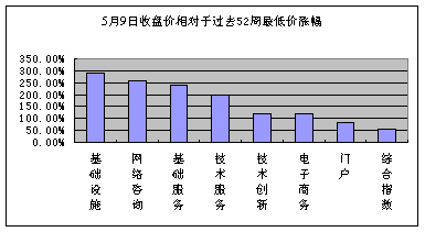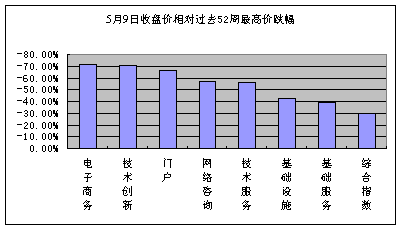 这样,本文的分析思路就是:以上述这些经验性推论为基础,按照国信证券网络股的分类,计算100只样本股的5月9日收盘价相对于过去52周最高价的跌幅以及相对于过去52周最低价的涨幅,结合其盈利情况等其他数据进行综合分析,得到关于网络股投资理念变迁的一些结论。