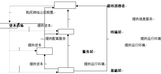 图1为网络产业三个层次之间以及与消费者、资本市场关系的示意图。其中实线表示服务流量,虚线表示资本流量。