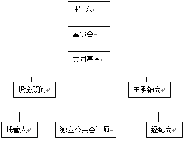 自1924年起,美国共同基金即采取公司型治理模式,1940年以后出台的《投资公司法》、《投资顾问法》等法律进一步明确了按照公司型制度来运作管理共同基金的有关细节。在公司型治理模式下,共同基金首先是一个法人组织机构,该机构由投资顾问公司和其他发起人共同发起并按照股份有限公司的募集设立方式在基金单位发售达到规定最低数额后设立。但共同基金公司与股份有限公司不同之处在于它通常没有自己的雇员,只设立一个基金董事会来代表基金持有人利益,而各项具体运作事务主要是委托其他公司完成。具体运作主体如下(见图1):