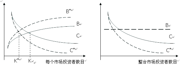 然而,技术革新极大地改变了交易所的成本函数和效用函数,降低了交易所行业的进入障碍,使新进入者可以迅速地打破原有市场的自然垄断局面。首先,信息技术的广泛运用降低了交易所的系统运作成本,使曲线C向下移动到曲线C*,这表明某些新交易系统可通过采用创新技术,与具有规模经济但采用旧技术的传统交易所进行竞争。其次,电子化交易提高了交易速度和透明性,从而提高了投资者的交易执行质量和效用,使B曲线向上移动到B*曲线。技术革新带来的低成本和高效用结合在一起,就使交点K向左移动到K*。这表明新系统只要达到较低的临界规模就可以生存下来。再次,技术革新也降低了投资者在不同市场间进行交易的转移成本,在转移成本接近零的情况下,交易效用将依赖于所有市场上投资者的总数量,而不是某一特定市场上的投资者数量,此时网络外部性将失去作用,效用函数成为图2中的水平线B。因此,新进入者可通过提供较低成本的交易服务来击败成本较高的传统市场。