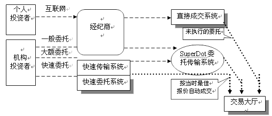 直接成交系统(NYSE Direct)允许会员公司(会员公司也将允许客户)将1099股以下的委托指定为“自动撮合委托”,这种委托将和专家手中的限价委托,以及其他自动撮合委托进行自动撮合,而不能立即撮合的“自动撮合委托”将自动转化为竞价市场中的限价委托。可见,直接成交系统的运作与ECN大致相似,它有助于纽交所吸引个人投资者(特别是网上投资者)的委托流量,与既有的ECN展开竞争。