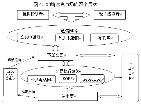 近年来,纳斯达克市场在全球媒体和公众面前已树立起电子化交易所的形象,但事实上,纳斯达克并不是一个完全自动化的电子交易所,相反,却是一个由做市商和其他市场参与者所组成的分散式交易网络。从市场参与者角度来看,可以将纳斯达克分为四个层次: