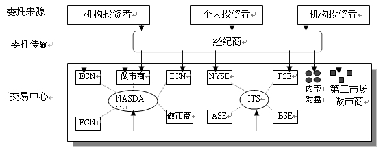第一层次为投资者,其中散户投资者不能直接进入纳斯达克市场,必须通过下单公司(Order-entry Firm,向NASD注册为经纪商);而机构投资者不但可通过下单公司参与市场,也可直接与纳斯达克做市商进行交易,更可以彼此间进行内部对盘。第二层次为下单公司,如美林、培基、潘恩·韦伯等券商以及所有的网上经纪商,其主要功能是接受投资者买卖委托,并决定将这些委托传送给特定的做市商,从而为投资者取得最佳执行价格。但在实践中,由于做市商向下单公司支付费用,或者由于做市商和下单公司同属一家公司,因此下单公司一般倾向于将投资者委托传送给关系密切的做市商,而并非传送给能提供最佳报价的做市商。第三层次为纳斯达克的委托传输系统,其中SOES自动将小于1000股的委托传送至做市商,而Slectnet则用于做市商之间进行协议定价。第四层次为纳斯达克交易机制的核心,即做市商。目前纳斯达克市场共有500余家做市商,这些做市商在交易时间内提供所负责股票的双边报价,通过相互之间的报价竞争来争取委托单,而其利润则来源于出价和要价之间的买卖价差(Spread)。