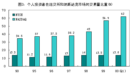 再次,证券市场繁荣和网上交易盛行导致了投资者的分层化。一方面,随着战后“婴儿潮”时期出生的美国人不断地将资金投入证券市场,机构投资者,尤其是养老基金获得了迅猛发展。美国养老基金的资产总额已从1994年的3.2万美元增长到1999年的7.8万亿美元。另一方面,随着互联网日益普及和所谓“X世代人 (Generation X) ”逐步成为社会中坚,证券投资正成为一项平民化的运动,美国网上投资者开户数已从1996年的150万增加至2000年上半年的1800万。个人投资者在网上可方便、快捷和低成本地获取各种投资信息,并能在各个市场间快速自由地转换,其交易行为对整个股市走向,特别是纳斯达克技术股的走向具有决定性的影响,投资者内部的力量均衡正在悄悄地发生着倾斜。
